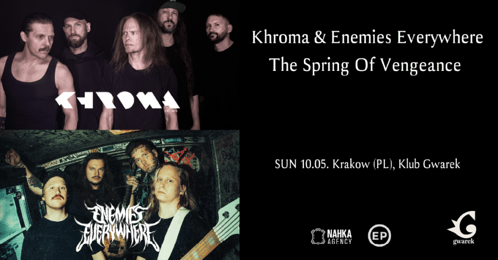 Fińscy mistrzowie metalu, Enemies Everywhere i Khroma, ruszają w ultra-ciężką wiosenną trasę po Polsce i krajach bałtyckich. Mini-tourneé zespołów rozpocznie się na początku maja w Helsinkach, a następnie poprowadzi przez Estonię i Litwę prosto do Polski. Przystanek na trasie w krakowskim Klubie Gwarek odbędzie się w niedzielę, 10 maja 2026 roku.