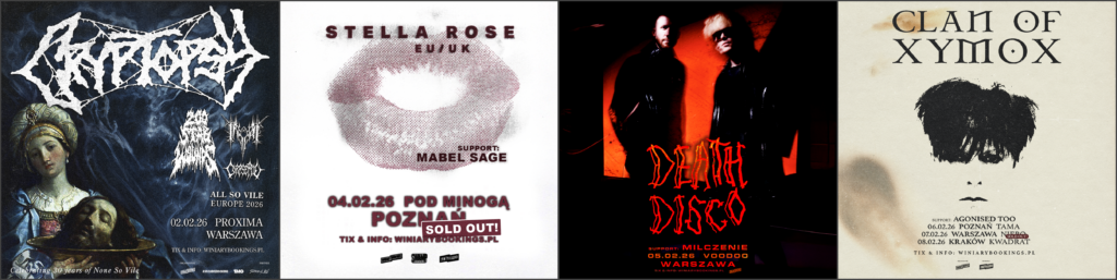 Przyszły tydzień pod znakiem koncertowej wędrówki po Polsce – różne miasta, różne sceny i cztery wyraziste muzyczne światy. Cryptopsy, Stella Rose, Death Disco oraz Clan of Xymox pojawią się na trasach, które łączy wspólny mianownik: bezkompromisowa estetyka i silne emocje na żywo. Za organizację wszystkich wydarzeń odpowiada Winiary Bookings, zapowiadając tydzień pełen kontrastów i intensywnych koncertowych doświadczeń.