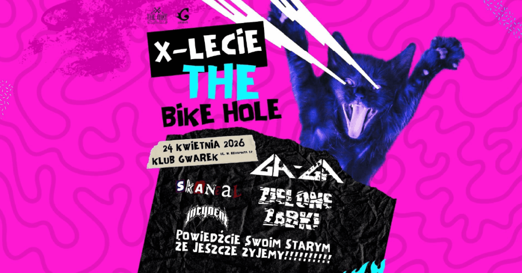 Zapraszamy na wspólne świętowanie X-lecia serwisu The Bike Hole. Na scenie klubu Gwarek wystąpią weterani punk rocka Gaga / Zielone Żabki. Wspierać ich będą nie mniej legendarni załoganci z Skandalu (Tak to ten zespół gdzie Lisu naparza w struny) oraz Incydent (nie-kałowy).